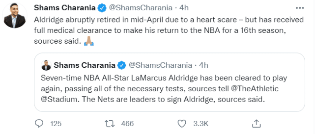 阿尔德里奇要是回归篮网,也会遇到老熟人。他和帕蒂-米尔斯在马刺开拓者都当过队友,如果他签约篮网,这将是两人合作的第三支球队。