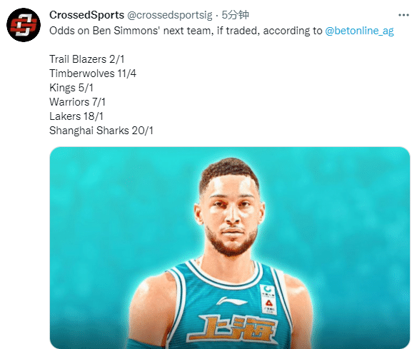 西蒙斯下家的最新赔率出炉,开拓者1赔2排名第一,森林狼4赔11、国王1赔5、勇士1赔7、湖人1赔18以及上海大鲨鱼1赔20;美媒配上西蒙斯身穿上海队的球衣,究竟西蒙斯何时才能离队?估计还要闹一段时间,76人何时降价决定了他的闹剧周期。