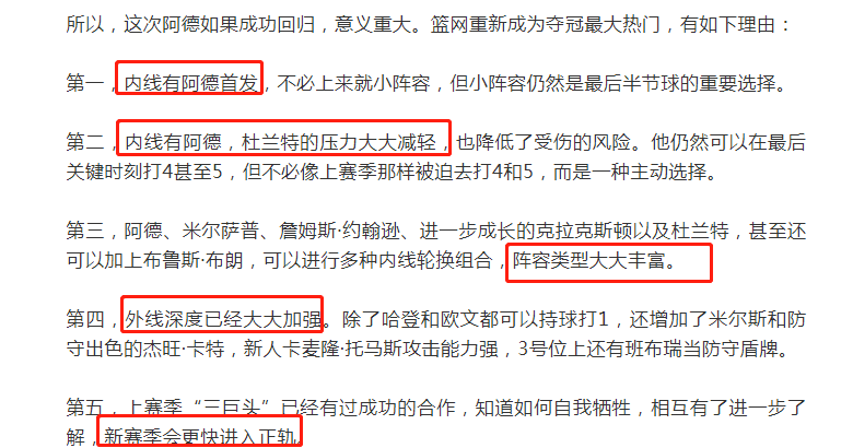 第一,篮网不用一直使用小个阵容,比较灵活;第二,有阿德之后,KD压力会大大减轻;第三,篮网阵容类型丰富;第四,外线深度也已经大大加强,米尔斯和新人托马斯等,可以委以重任;第五,三巨头的磨合时间不短了,新赛季会很快进入正轨。