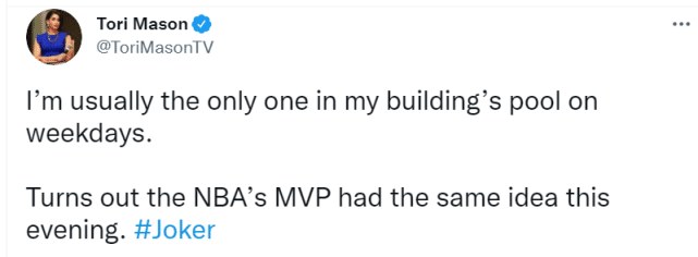 24直播网9月02日讯 ,丹佛CBS电视台女主播Tori Mason更新社媒,晒出了一张自己和约基奇的合影。她配文写道:“通常周末的泳池里只有我自己,看来NBA的MVP今晚也有同样的想法。Joker(小丑,约基奇的绰号)”