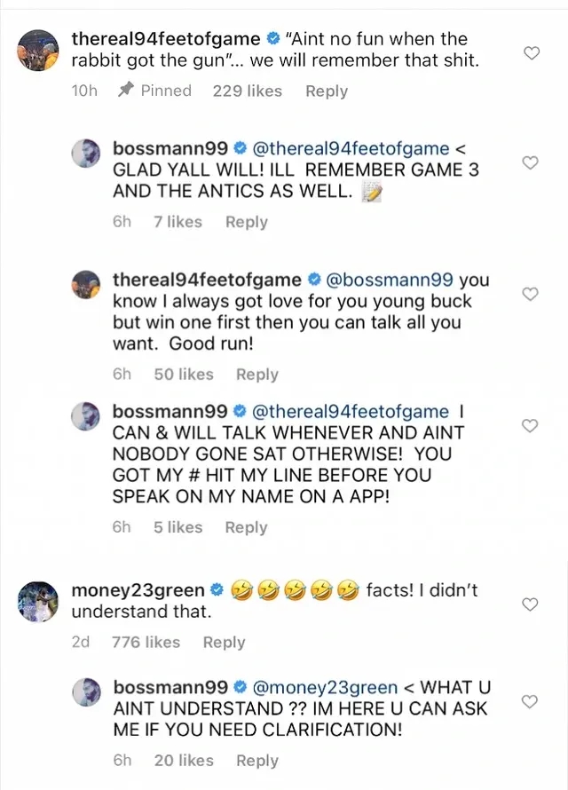 有趣的是追梦格林也在下面留言表示不理解克劳德的举动,但遭到克劳德怼人“你不明白什么啊?我就在这里,如果你需要解释,可以问我”之后克劳德删除了与汉迪带有火药味的对话,可能是因为他此前曾作为骑士球员跟汉迪有交情,不想闹得那么僵吧!