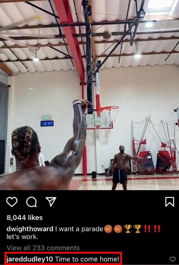 很明显,霍华德想要加盟一支有实力夺冠的球队,不仅想要冲击生涯第二冠,而且想要一个夺冠游行;于是杜德利招募霍华德重返湖人,不过可能是怕被联盟罚款,杜德利貌似已经删除了这条动态。