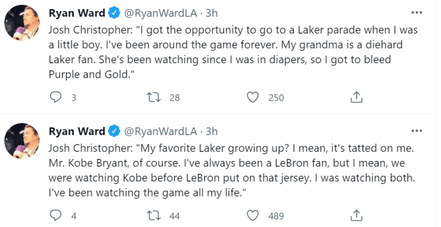 克里斯托弗还表示自己儿时参加过一次湖人的夺冠游行。他的奶奶是湖人死忠,在他还是个婴儿时,他奶奶就已经是湖人的球迷了。巧合的是目前选秀网站NBADRAFT上,克里斯托弗的预测顺位就是湖人的首轮第22位。