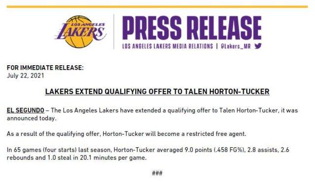 2020-21赛季,库兹马场均12.9分6.1篮板1.9助攻,施罗德场均15.4分3.5篮板5.8助攻。库兹马还在合同期内,是湖人交易的主要筹码之一,而施罗德将成为自由球员,湖人可以通过先签后换的方式把他送走。霍顿-塔克是另一个可能被送走的球员,湖人官方宣布,已经为他提供资质报价。