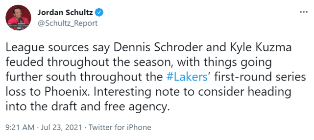 来源:24直播网07-23 11:4324直播网讯 北京时间7月23日,据ESPN记者Jordan Schultz爆料,联盟消息源透露,湖人球员施罗德和库兹马整个赛季的关系都不好,两人在征战季后赛首轮时关系进一步恶化。Schultz的爆料引起热议,不少球迷建议湖人还是把两个球员都送走,避免影响球队的化学反应。