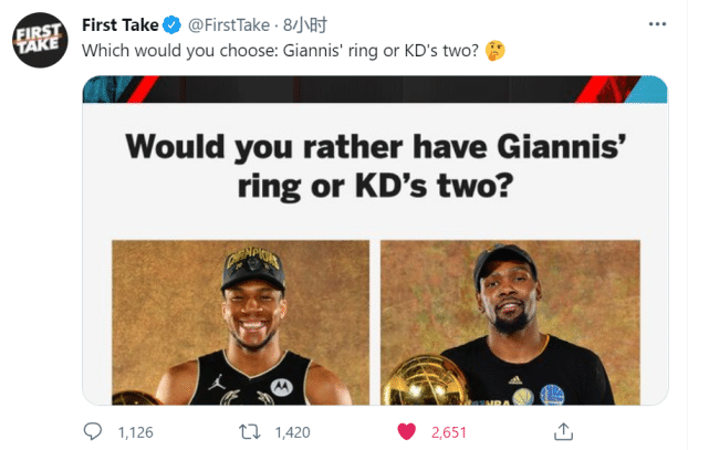 字母哥的这番话很难不认人觉得他是在映射杜兰特或者詹姆斯等球星。而就在今天,ESPN的一档节目first take展开辩题:字母哥的1冠和杜兰特的2冠,你更愿意要哪个?