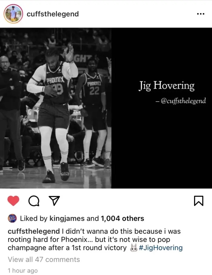 最后一场比赛结束前,克劳德在球场上跳起了舞蹈,被认为这是嘲讽的一种行为!因为他跳的这个舞蹈是模仿的詹姆斯在一段代言饮料广告中的舞蹈动作,今日一位网友晒出了克劳德跳舞的图片并附文““我不想这么做,因为我在支持太阳……但是在首轮获胜后就喷洒香槟并不明智。”