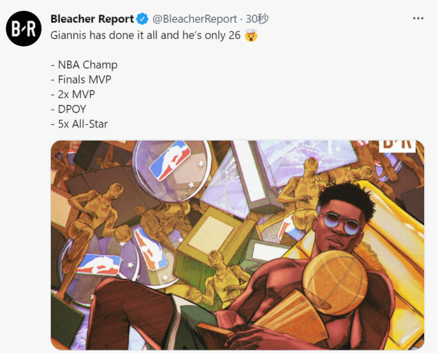 字母哥在总决赛首秀打出如此惊人的表现,也被美媒刷屏,BleacherReport就制作了神图,庆祝字母哥已经成为了大满贯球员。在拿到FMVP殊荣之后,字母哥生涯至今已经斩获MVP(两次)、FMVP、最佳防守球员、MIP和全明星MVP。在NBA历史上,拿到过多个MVP,还有FMVP和DPOY在手的球员仅有两人,一个是乔丹,另一个就是字母哥。