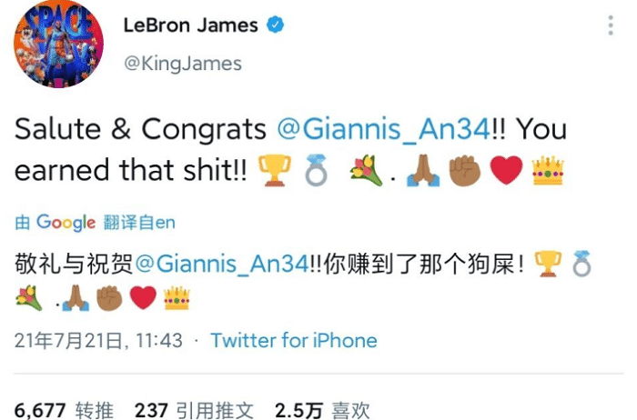 湖人球星詹姆斯发推恭喜字母哥夺冠!
