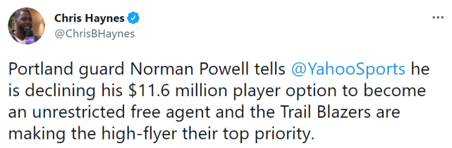24直播网讯 北京时间7月21日,据名记克里斯-海耶斯报道,开拓者后卫诺曼-鲍威尔已经决定拒绝执行2021-22赛季的球员选项,在当地时间8月1日成为一名不受限制的自由球员。鲍威尔的选项价值1160万美元,他预计在今年夏天能签到一份多年合同且年薪高于这一标准。
