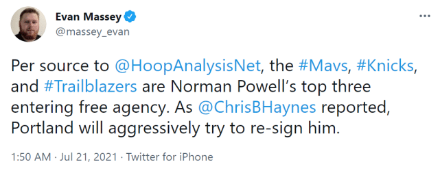 28岁的鲍威尔,将吸引多支球队的追逐,其中也包括开拓者。消息源透露,开拓者已经把续约鲍威尔当作球队休赛期的头号任务。另据NBA记者埃文-马塞报道,在鲍威尔进入自由球员市场后,他的前三选择将是独行侠尼克斯和开拓者。