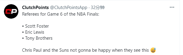 总决赛G6裁判出炉之后,美媒ClutchPoints发推:看到这样的裁判员,保罗和太阳会不开心的;快船记者Farbod Esnaashari发推:斯科特-福斯特是一个篮筐,而其他裁判都是球员。