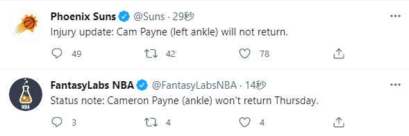 太阳轮换球员佩恩替补上场仅仅只打4分钟,4投1中拿到2分1助攻,在场正负值-5,受伤后返回更衣室接受治疗,最终确定伤退;佩恩仅打4分钟便受伤退赛,初步确诊为脚踝扭伤;保罗复出,保罗的替身伤退,但愿佩恩伤势无大碍,突然遭遇伤病太不幸了。