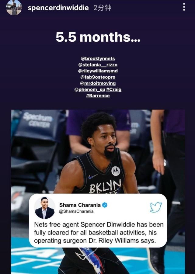查拉尼亚表示,丁威迪只有了5个月的时间就从十字韧带部分撕裂的伤势中康复,他将成为今年夏天自由球员市场上的顶级控卫。丁威迪本人第一时间转发了查拉尼亚的报道,并补充写道:“5.5个月。”