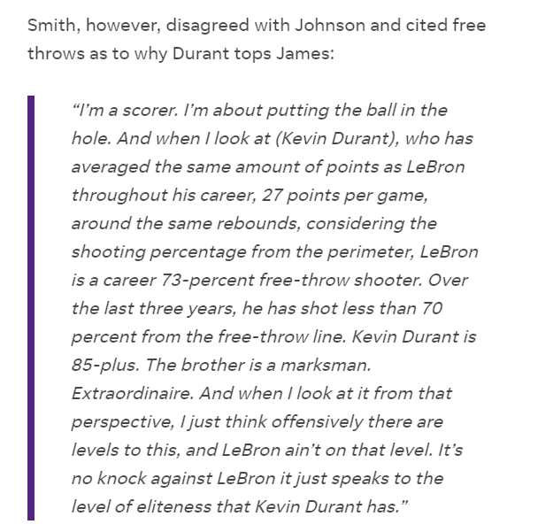 “作为一个得分手,你就是要把球送进篮筐。看看杜兰特,他的生涯场均得分和勒布朗一样,都是27分,篮板球也差不多,但考虑到外线命中率(杜兰特38.4%,詹姆斯34.5%)。詹姆斯的生涯罚球命中率是73%,过去三个赛季,还不到70%。杜兰特是85%以上,这兄弟是个超级得分手。我从这个角度来看,勒布朗的进攻和杜兰特不在一个水平上,这不是要抨击勒布朗,而是证明杜兰特的精英级别水准。”