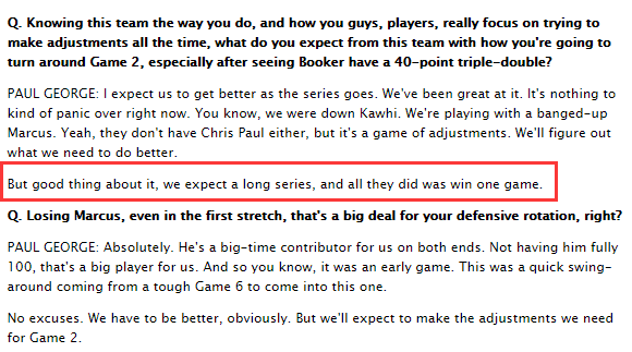 “我预计系列赛会很漫长,而他们(太阳)所做的只是赢了一场比赛而已。”,