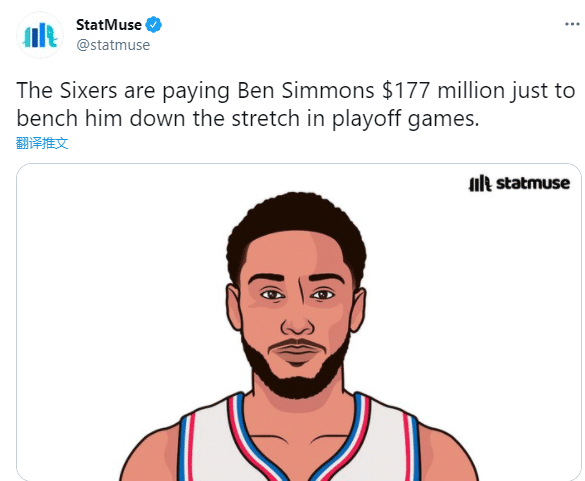 据统计东部半决赛整轮系列赛,西蒙斯末节总共就出手三次,近四战更是末节0出手;系列赛场均只有9.9分,作为费城核心球星之一,西蒙斯居然打出如此糟糕的数据,对此美媒StatMuse发推写道:76人狂砸1.77亿美元仅仅是为了让他在季后赛坐替补席。
