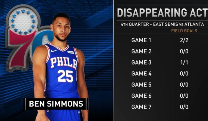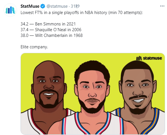 这轮系列赛,西蒙斯罚球命中率只有可怜的34.2%,超过06年的奥尼尔(37.4%)和68年的张伯伦(38%),创造历史单轮系列中最差罚球命中率纪录。西蒙斯罚球如此糟糕,难怪老鹰经常使用“砍西战术”,说实在的,罚球差可以继续练,为何一身天赋却不敢进攻,抢七关键时刻居然放弃上空篮的机会。