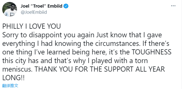 恩比德写道:“费城我爱你们。很抱歉再次让你们失望了,我希望你们明白,我已经竭尽全力。我要明确的唯一的事情就是,这座城市是强硬的,这也是为什么我会选择带着半月板撕裂的伤病继续上场。谢谢你们这一年的支持。”