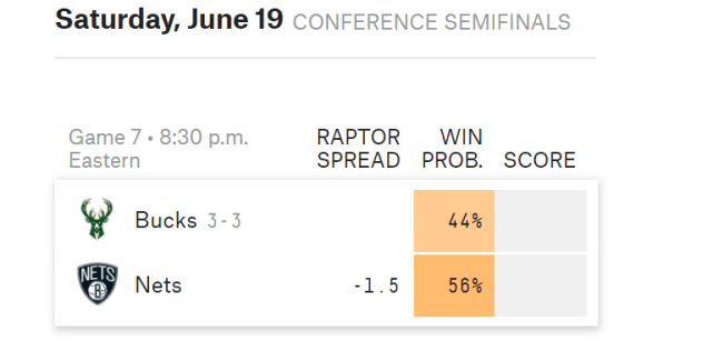 当然,最重要的还是能够拿下这场比赛的胜利。数据网站FiveThirtyEight最初给出的篮网晋级概率是61%,但这两天概率在不断下滑,赛前,已经降到了56%。字母哥和雄鹿正在势头上,虽然他们的客场表现不如主场,而且雄鹿队史上客场抢七是0胜7负,但看好雄鹿的人正在增加。