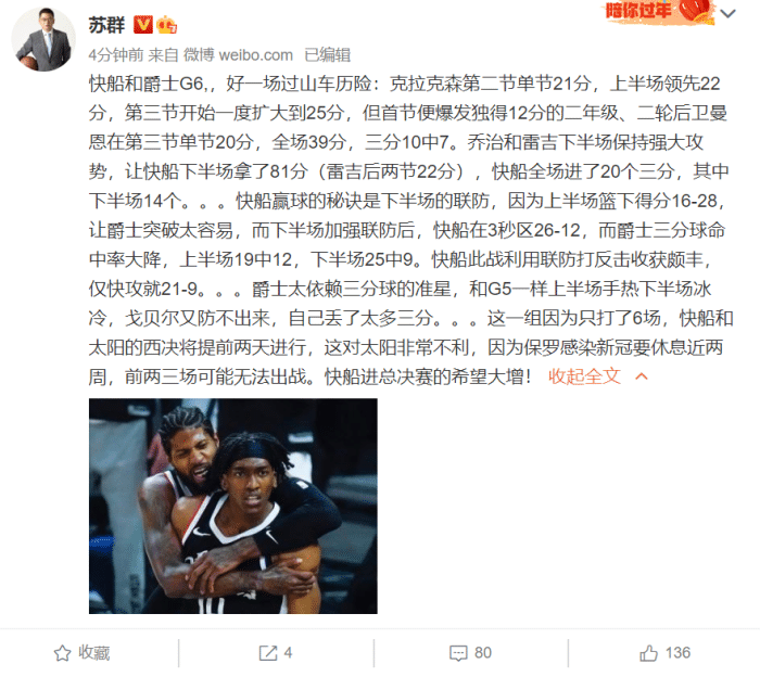 赛后苏群发微博称赞快船的表现,认为这场球快船下半场的联防起到奇效,小阵容又拉开空间让戈贝尔被打爆。而且他表示快船进总决赛的希望更大,原因在于快船没经历抢七所以西决提前两天进行,而保罗感染新冠也得不到太多的时间调整,所以这对于太阳是不利的!
