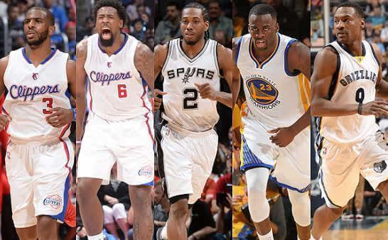 科怀-伦纳德 (马刺队、242)、德雷蒙德-格林(勇士队、229)、托尼-阿伦 (灰熊队、207)、德安德烈-乔丹(快船队、187)、克里斯-保罗 (快船队、170)