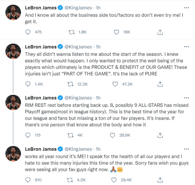 詹姆斯接着写道:“如果要找一个最了解身体、了解一整年身体运作的人,那就是我了!我为我们全体球员的健康发声,我讨厌在一年的这个时候看到这么多伤病。对不起,球迷们,真希望你们现在能看到自己最喜欢的球员打球。”