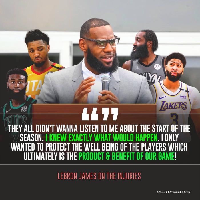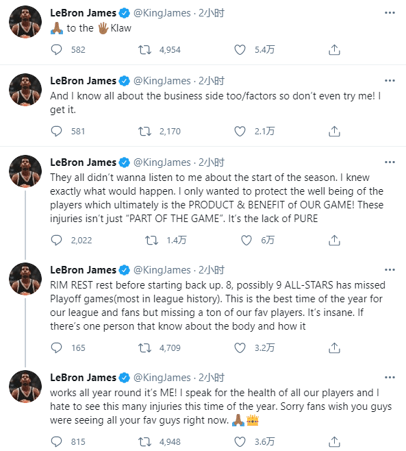 詹姆斯发推写道:关于赛季的开始时间,他们都不想听我的话,我早就知道会发生什么,我只想保护球员的健康,而这些伤病不是比赛中的一部分,这是由于赛季重启太早球员缺乏休息导致的。