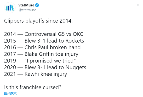 美媒StatMuse列出快船在14年后遭遇的各种不幸——15年3-1领先火箭遭逆转,16年保罗受伤,17年格里芬脚趾受伤,20年快船3-1领先被掘金逆转,今年则是小卡遭遇膝伤,快船被诅咒了吗?