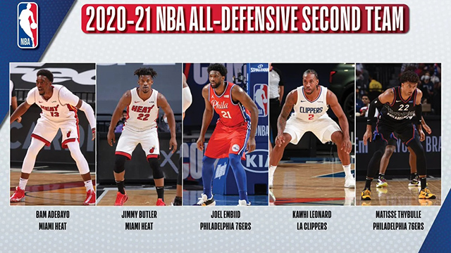 巴姆-阿德巴约(热火、111分)、吉米-巴特勒(热火、111分)、乔尔-恩比德(76人、87分)、科怀-伦纳德(快船、43分)、马蒂斯-塞布尔(76人、63分)。