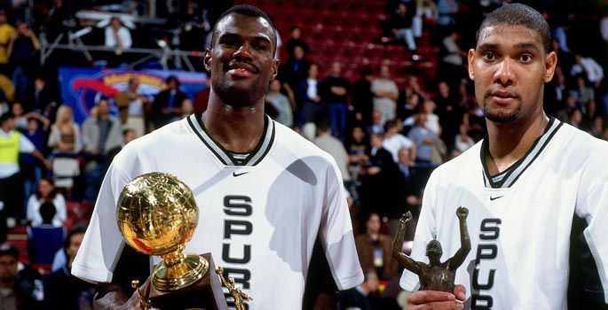 爵士先强后弱,马刺则一直坚挺。新秀季便入选最佳阵容第一队的邓肯愈发生猛,场均21.7分11.4个篮板2.52次盖帽,投篮命中率49.5%,是该季唯一在上述统计中都进入前十的球员,再次跻身最佳阵容第一队。马里奥•埃利进入首发后,马刺从开局6胜8负的萎靡中醒来,与爵士一样取得西部最好的31胜19负。双塔一出,谁与争锋,马刺在季后赛中更加可怕,晋级不商量,先后碾过森林狼湖人和开拓者,仅耗时13场便杀入总决赛。