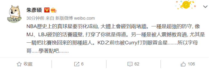 字母哥再次被打服,此前的采访中他就说过杜兰特是防不住的,只能限制!这场赛后他再次送上赞美“他现在是这个世界上最好的球员”中国名嘴朱彦硕发微博“KD之前也被Curry打到眼冒金星.......所以字母哥.....学着点吧.......”