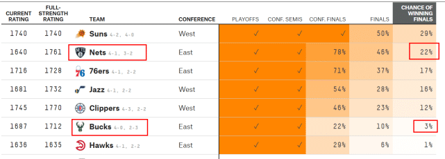 当然,对于篮网来说,没有拿到第四场胜利前,他们还不是最终的胜利者。下一场比赛,将回到雄鹿的主场,而FiveThirtyEight认为雄鹿在G6赢球的概率达到60%,如果雄鹿最终赢下G6,两队将进入抢七大战!
