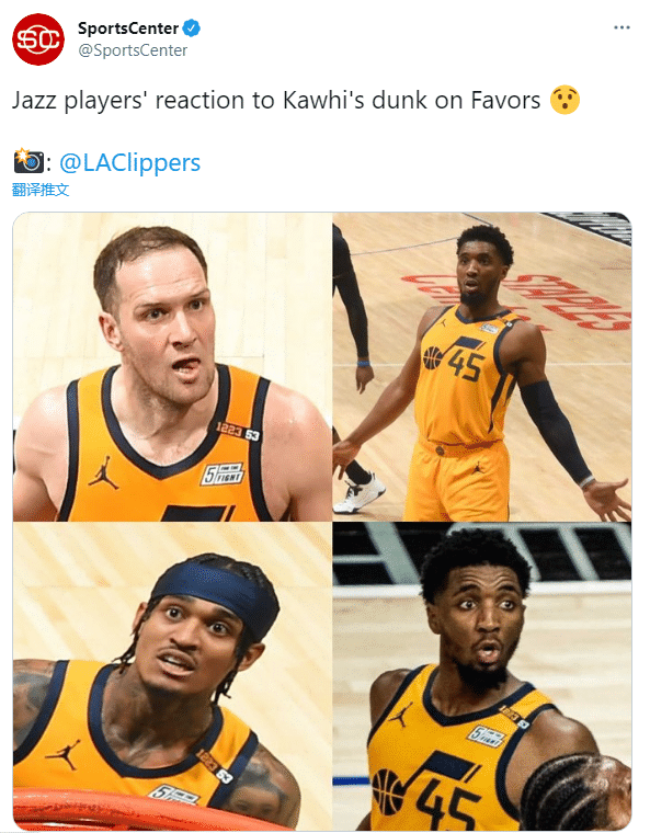 而当莱昂纳德隔扣的一瞬间,摄影记者也拍下了身旁米切尔的反应。只见米切尔一脸惊讶,他张大了自己的眼睛,而嘴巴也张圆了,对于这球显然感觉不可思议。而快船官方也发布了莱昂纳德扣篮时,爵士球员的表情,他们都震惊了!