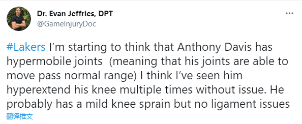 浓眉膝盖伤势如何?医学专家发推写道:我开始认为戴维斯的膝盖没问题,我已经见过他多次导致膝盖过度伸展,他可能只是轻微的膝盖扭伤,韧带没有任何问题。