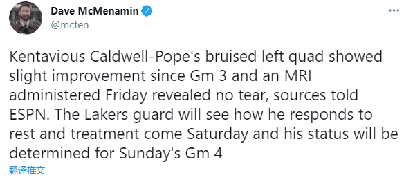 湖人记者Dave McMenamin报道,波普左四头肌的状况在G3结束后略有改善,今日的核磁共振结果显示没有撕裂。波普将在本周日看看自己休息和治疗后的反应,并决定周一的出战状态。