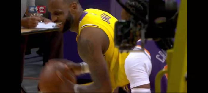 有趣的是,詹姆斯这个动作也激怒了克劳德,在随后的太阳队进攻回合中,克劳德上演了怒推老詹的一幕,没有防备的詹姆斯也是一下被推倒到中线,克劳德也因此吃到了进攻犯规,不过让他失望的是,詹姆斯并没有因此发生情绪波动,显然此时这个36岁的新秀已经开始在享受比赛了。