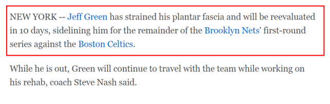 对于篮网来说,系列赛并非一帆风顺,G3赛前就传来一个坏消息,伤病又缠上了他们。杰夫-格林足底筋膜拉伤,将在10天后再次评估伤情,这意味着格林至少要休战10天,他将缺席篮网vs凯尔特人这轮系列赛的余下比赛。主教练纳什表示,当格林伤停的这段时间,他将和球队待在一起,也会前往客场,同时进行康复训练。