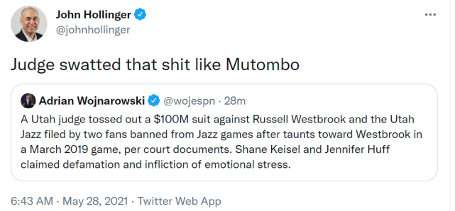 24直播网讯 北京时间5月28日,据名记沃纳罗斯基报道,一位犹他的法官驳回了两位球迷对威斯布鲁克和爵士高达1亿美元的索赔。这两位球迷曾在2019年3月的一场比赛中和当时效力雷霆的威少发生争吵。随后,他们俩已经被爵士禁止现场观赛。两位球迷随后提出诉讼,把威少和爵士告上法庭,理由是自己受到了诽谤与精神困扰。