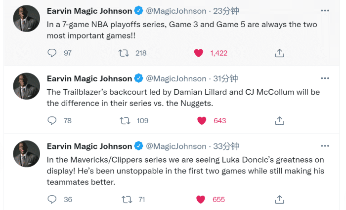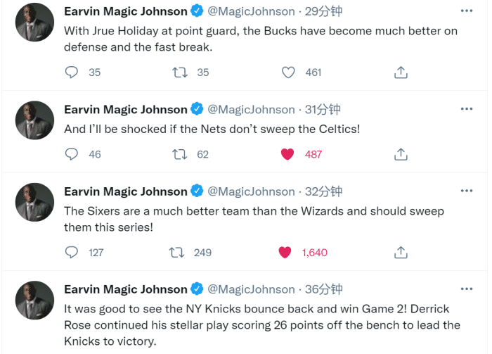 24直播网讯 北京时间5月27日,尼克斯主场击败老鹰扳回一城,76人则是大胜奇才将系列赛大比分改写为2比0!湖人名宿魔术师约翰逊向来喜欢在社媒上发表自己对比赛的看法。而就在刚刚,魔术师一下连发了7条推文!