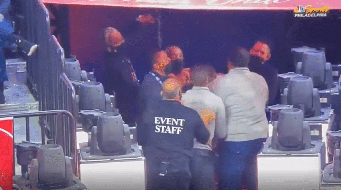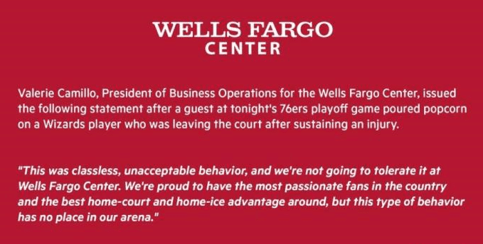 赛后这件事也发酵了,冲上全美热搜,因为这种事是在伤害球员!你可以喷垃圾话,但这种行为是不被允许的,76人官方发表声明“这是完全不可接受的行为,我们绝对不能容忍。我们对拥有全国最热情的球迷、最棒的主场、最舒适的主场优势感到自豪,但这种行为绝对不能出现在我们球馆。”