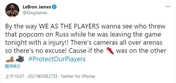 老詹也是积极发声力挺“作为球员,我们想知道那个在威少伤退途中冲他撒爆米花的混蛋是谁!球馆各个位置都有摄像机,因此没有任何借口!保护我们的球员。”希望这位球迷冷静点吧,支持自己的主队没问题,但请注意自己的举止,有些事是不能做的!