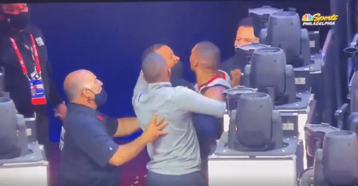 这一举动彻底惹怒了威少,本就性格耿直的他,一时之间忍不住了,6名工作人员怒指球迷,威少转过头就想找这位球迷理论,好在身边的工作人员控制及时,否则可能会出现严重的后果!想一想当年的奥本山宫事件,阿泰等人就是因为球迷的不理智行为被激怒,最终导致恶性事件发生!