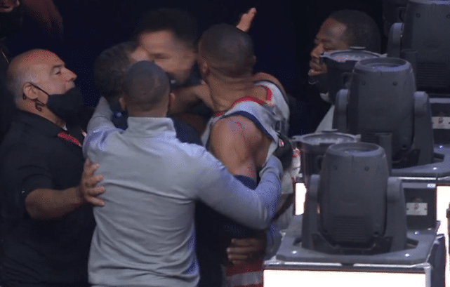 来源:24直播网05-27 11:2024直播网讯 北京时间5月27日,奇才客场95-120不敌费城,威少末节脚踝受伤退场,在离开球场前,有球迷把爆米花扔到威少头上,威少想要冲回球场和球迷理论,但被工作人员拦下。随后,这位球迷被驱逐出场。