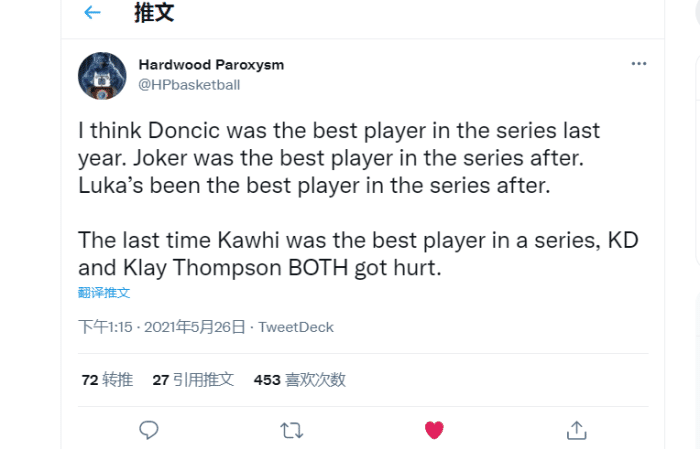 名记Hardwood Paroxysm调侃小卡:去年季后赛,东契奇就是快船独行侠两队表现最好的球员。而西部半决赛快船打掘金约基奇是系列赛最好的球员。今年快船独行侠打到现在,东契奇还是两队最好的球员!小卡上一次在系列赛中成为最好的球员还得是2019年总决赛杜兰特、汤普森都受伤的情况下。