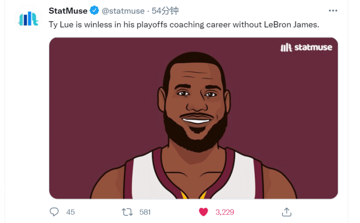 美媒statmuse则吐槽泰伦卢在没有詹姆斯后还没有在季后赛赢过球!
