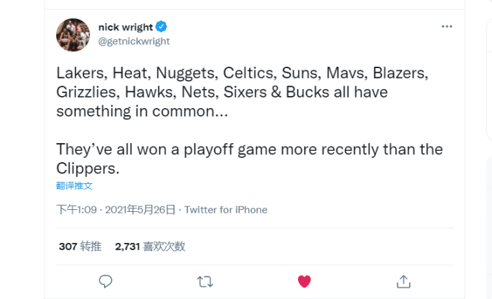 名记nick wright的吐槽更扎心:湖人、热火、掘金、凯尔特人太阳、独行侠、开拓者灰熊老鹰篮网76人雄鹿都有一个共同点,去年快船3比1领先掘金后,这些球队都在季后赛赢过球,而快船没有。