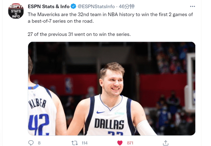 没有什么比连丢两个主场更难了!据ESPN统计,独行侠是NBA历史上第32支在七场四胜制的系列赛中开局连赢两个客场的球队,前31支球队最终有27支成功晋级,也就是说独行侠现在打入西部半决赛的概率高达87%!