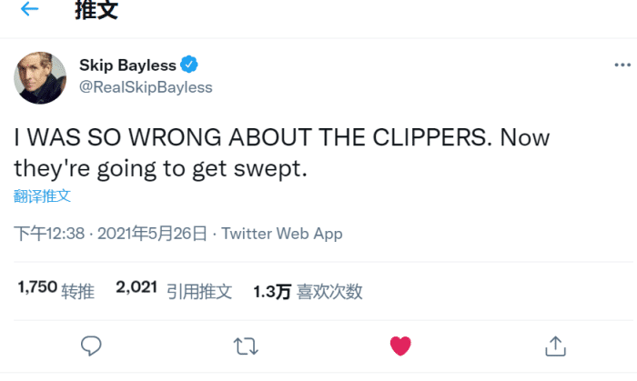名记skip bayelss此前曾预测快船本赛季会夺冠,但看到快船再次输球后,他第一时间发推表示:我大错特错了,现在快船要被横扫出局了!