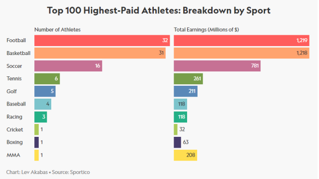 Sportico还分析了100强在各项运动中的分布情况:橄榄球32人、篮球31人、足球16人、网球6人,高尔夫5人,棒球4人,赛车3人,板球1人,拳击1人,综合格斗1人。
